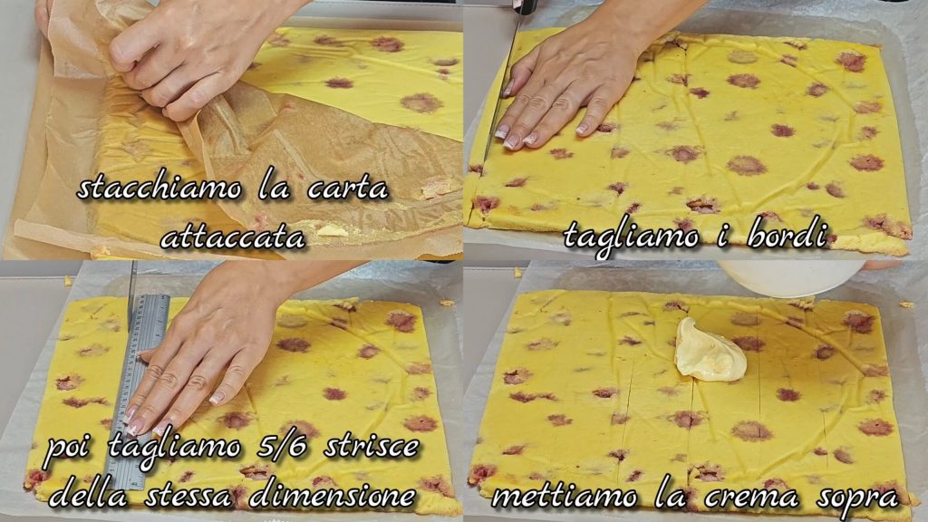 das Backpapier abziehen. Die Ränder abschneiden, dann 5/6 gleiche Stücke schneiden. Die Creme darauf geben,