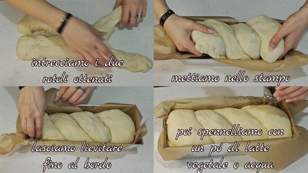 Wir flechten die beiden erhaltenen Rollen und legen sie in die Form. Wir decken sie ab und lassen sie bis zum Rand aufgehen, dann bestreichen wir sie mit Pflanzenmilch oder Wasser.