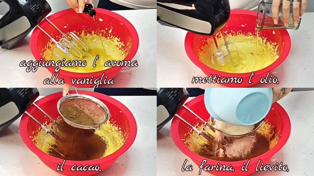Wir fügen Vanillearoma, das Öl, den Kakao, das Mehl und das Backpulver hinzu