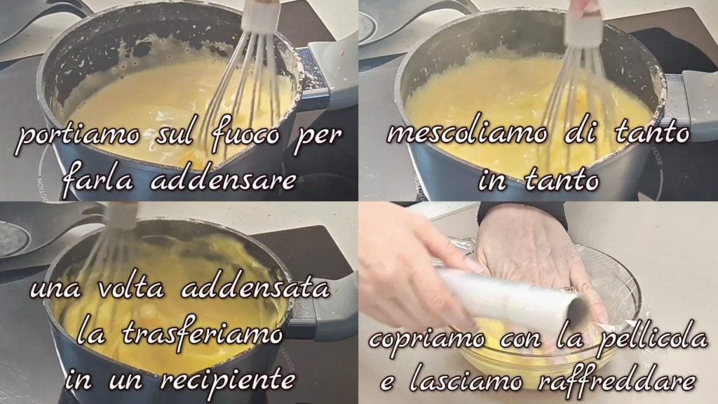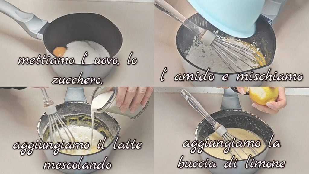 In einem Topf geben wir das Ei, den Zucker, die Stärke und mischen alles. Wir fügen die Milch nach und nach hinzu und die Zitronenschale.