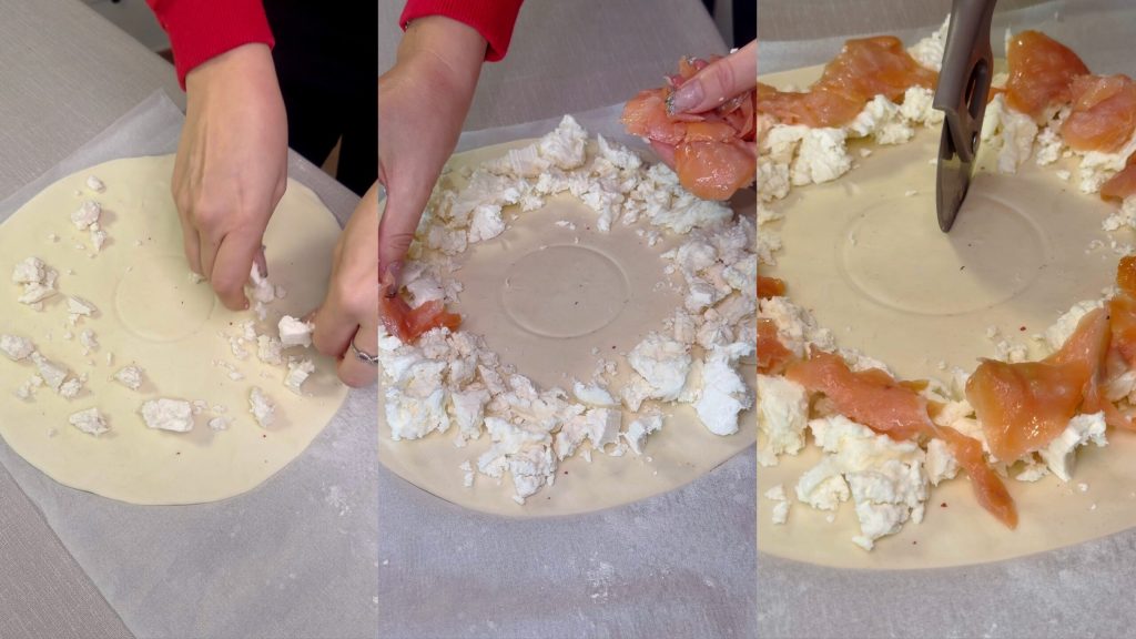 Rolle den runden Blätterteig auf Backpapier aus. Zerbröckele den Feta auf dem Teig, wobei die Mitte frei bleibt, um einen Ring zu bilden. Füge die zerkleinerten Mozzarellastücke und die Scheiben von geräuchertem Lachs über dem Feta hinzu und verteile sie gleichmäßig. Schneide mit einem Rad oder Messer den Blätterteig in acht Stücke im inneren freien Bereich.