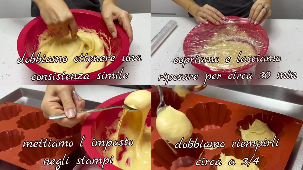 Wir decken es mit Frischhaltefolie ab und lassen es etwa 30 Minuten ruhen. Nach etwa 30 Minuten geben wir den Teig in die Formen und füllen sie zu etwa 3/4.