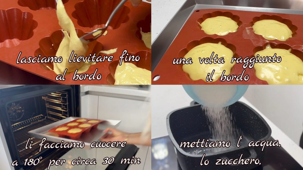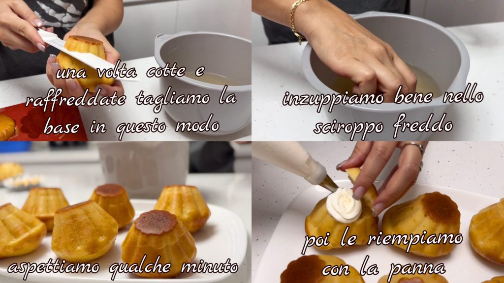 Wir nehmen die gebackenen und abgekühlten Savarinen und schneiden die Basis, so dass nur ein kleines Stückchen angebracht bleibt (schaut euch das Video HIER an). Wir tauchen sie in den zuvor vorbereiteten Sirup. Wir warten ein paar Minuten, damit der Sirup gut aufgenommen wird, dann füllen wir sie mit Schlagsahne.