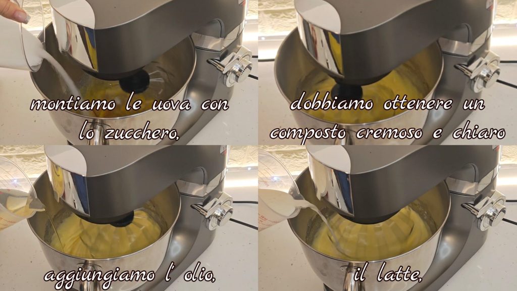 Die Eier mit dem Zucker schlagen, bis eine helle und cremige Masse entsteht. Öl, Milch hinzufügen,