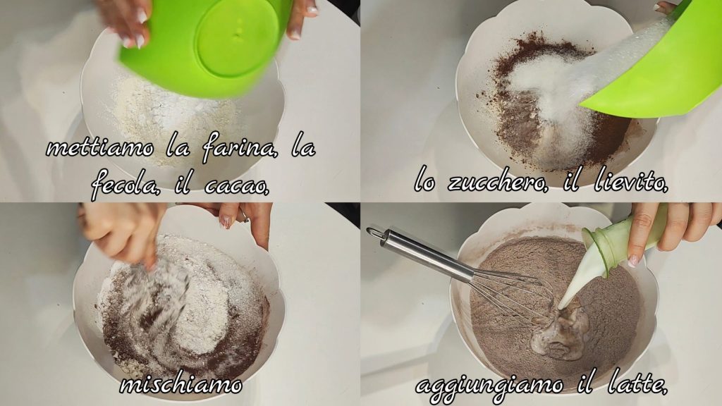 In eine Schüssel geben wir das Mehl, die Stärke, den Kakao, den Zucker, das Backpulver und mischen. Wir fügen die Milch hinzu,