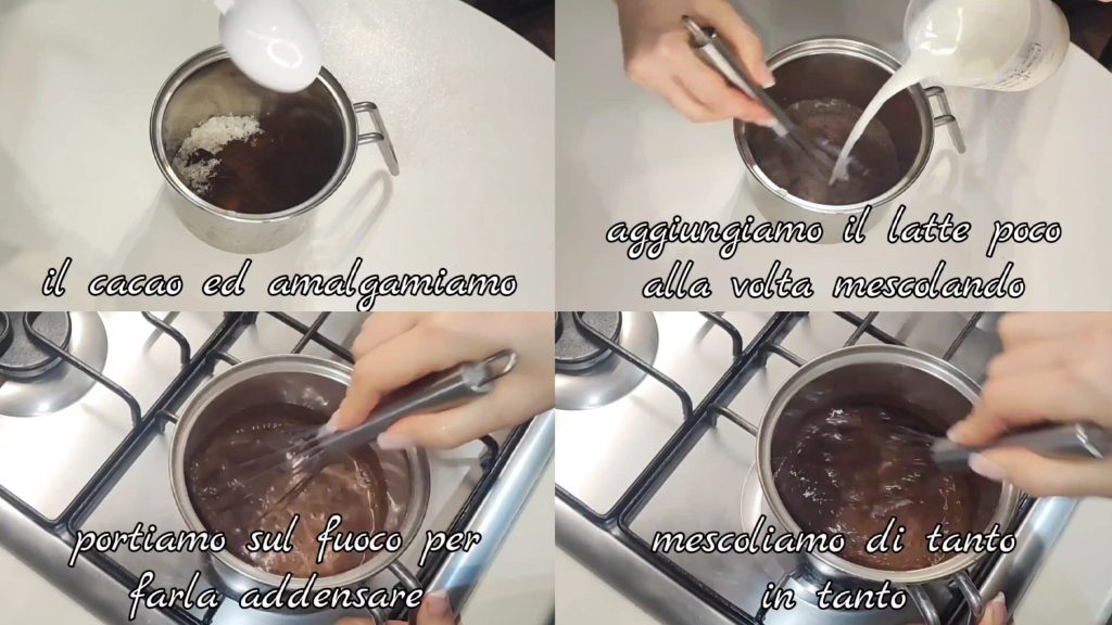 Kakao hinzu und mischen. Wir geben die Milch nach und nach hinzu und stellen es auf den Herd, um es einzudicken. Wir rühren gelegentlich um.