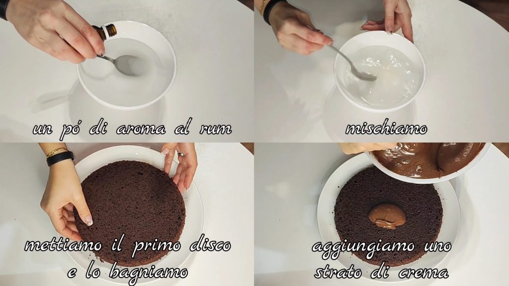 Wir fügen etwas Rum-Aroma oder Rum hinzu. Wir legen die erste Scheibe, tränken sie, fügen eine Schicht Creme hinzu und gleichen sie aus.