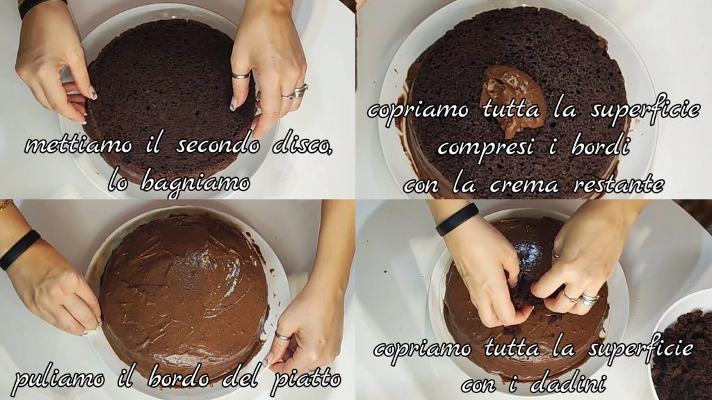Wir legen die zweite Scheibe, tränken sie, bedecken die gesamte Oberfläche mit der restlichen Creme. Wir reinigen den Rand, falls nötig, und legen die zuvor geschnittenen Würfel darauf.