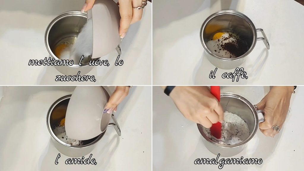 In einem kleinen Topf geben wir das Ei, den Zucker, den Kaffee, die Stärke und vermengen alles gut.