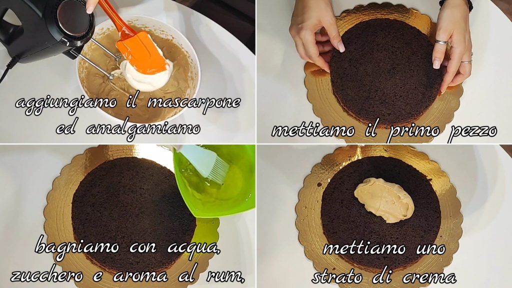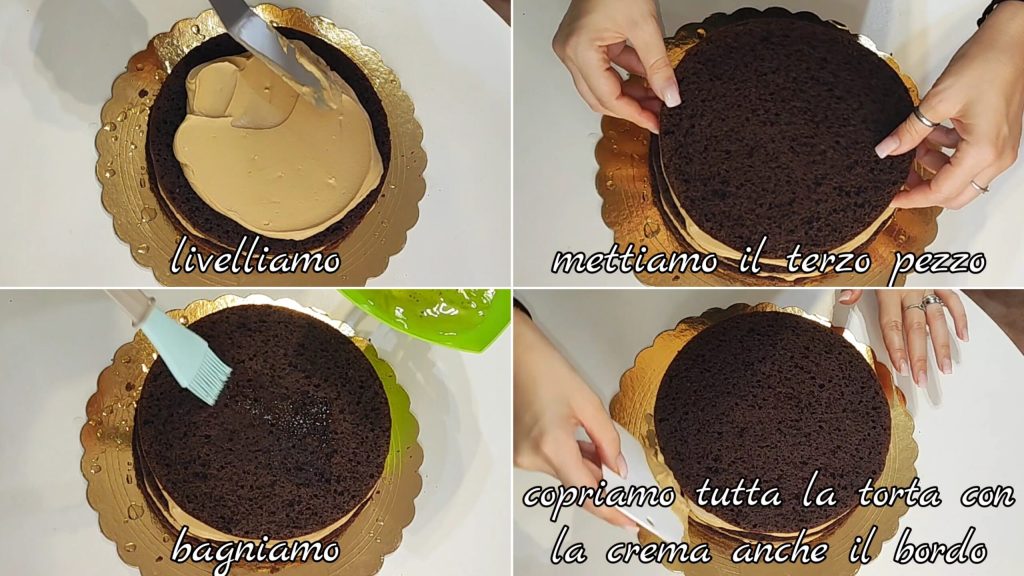 Wir glätten es. Wir fügen das zweite Stück Biskuit hinzu, tränken es und bedecken es mit einer weiteren Schicht Creme.