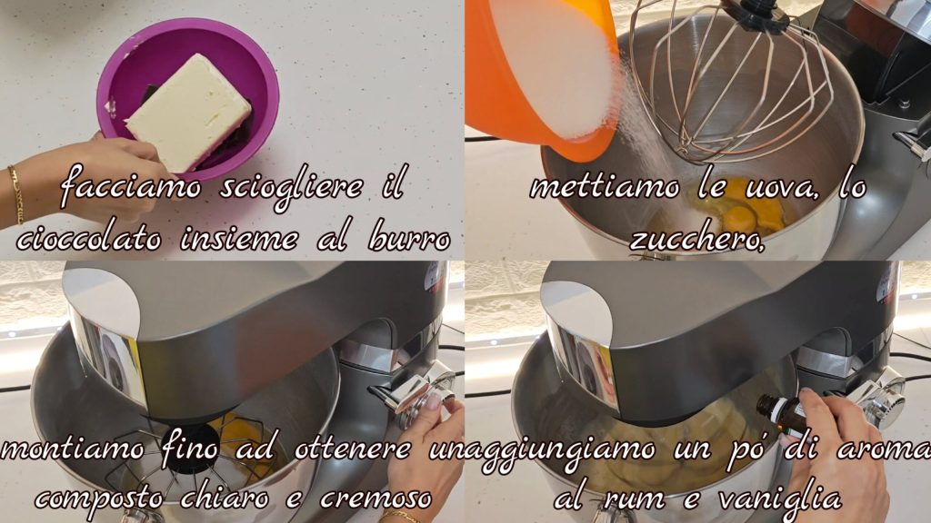 Schmilz die Schokolade zusammen mit der Butter. Schlage die Eier mit dem Zucker, bis eine helle und cremige Masse entsteht. Füge ein wenig Rum-Aroma und Vanille hinzu,