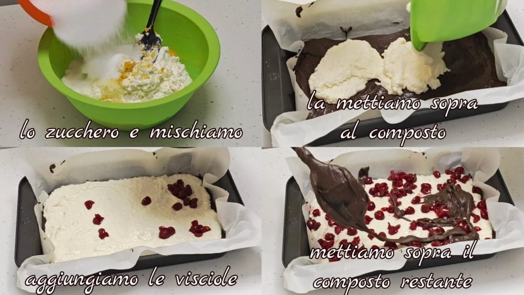 Füge den Zucker hinzu und mische. Gib die entstandene Creme auf den Boden, füge die entsteinten Sauerkirschen hinzu und bedecke mit der restlichen Masse.