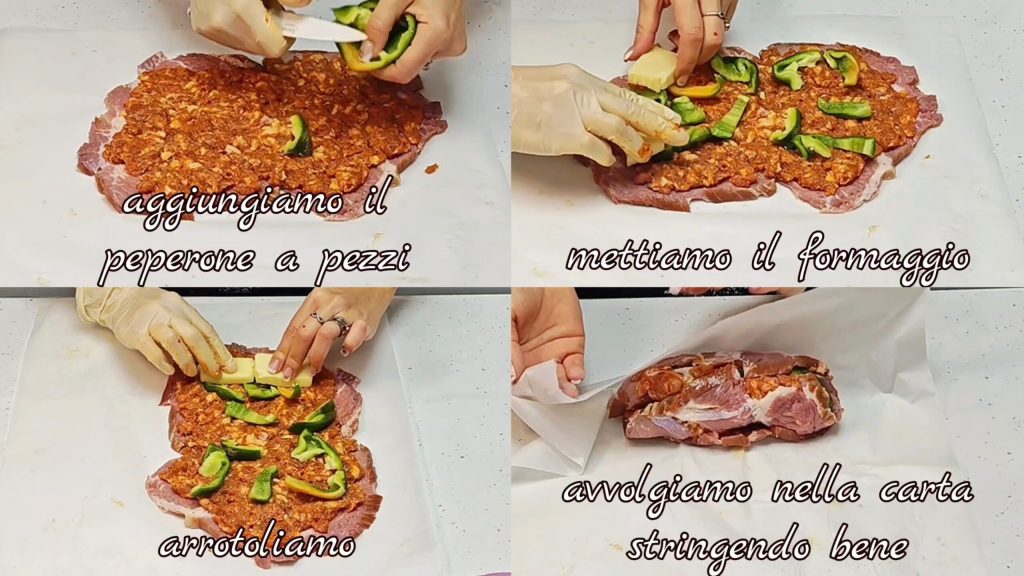 Wir fügen die Paprikastücke, den Käse hinzu und rollen alles auf. Wir wickeln es in das Backpapier und ziehen es fest zu.