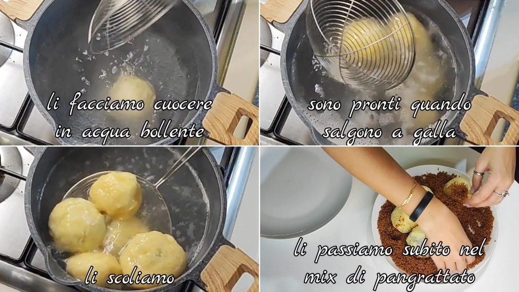 Sobald die Knödel fertig sind, diese für einige Minuten in kochendem Wasser kochen (wenn sie an die Oberfläche kommen, sind sie gar). Dann abgießen und in die vorbereitete Soße geben.