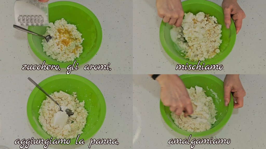 In einer Schüssel geben wir den gut abgetropften Ricotta, etwas Zitronenschale dazu,