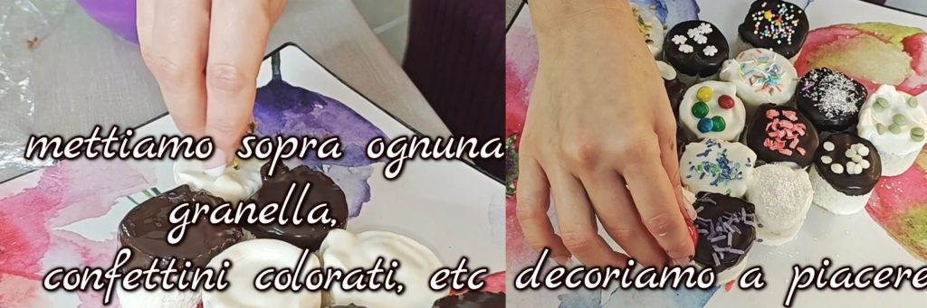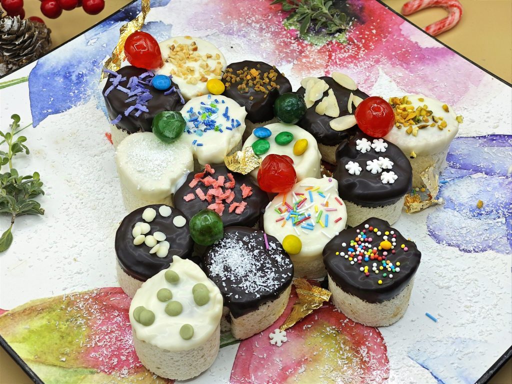 Wir stellen die entstandenen Röllchen für einige Stunden in den Kühlschrank, dann schneiden wir sie in etwas dickere Scheiben (ich habe jeden Röllchen in 3 Teile geschnitten), um die Schnecken zu erhalten. Wir tauchen sie in die geschmolzene Schokolade und ordnen sie an, um einen Baum zu formen.