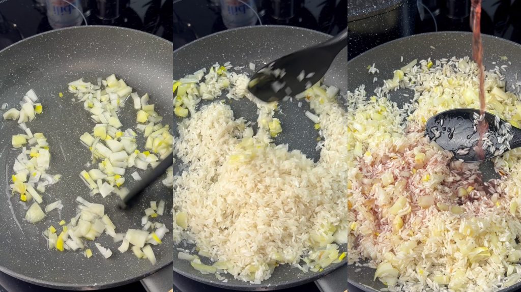 Dann gebe ich den zuvor abgespülten Reis hinzu und röste ihn ein paar Minuten an.