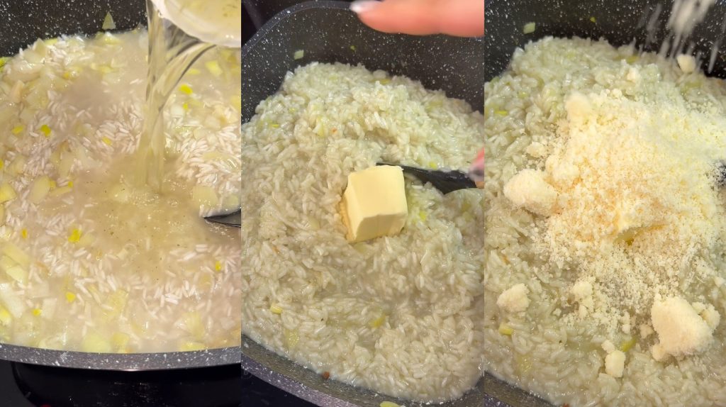 • Ich gebe die Brühe oder das Wasser nach und nach dazu und lasse den Reis gar werden.