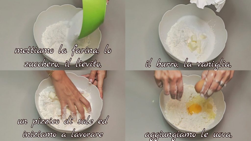 Wir geben das Mehl, den Zucker, die Butter, die Vanille, eine Prise Salz hinzu und beginnen, es mit den Händen zu verarbeiten. Wir fügen die Eier hinzu