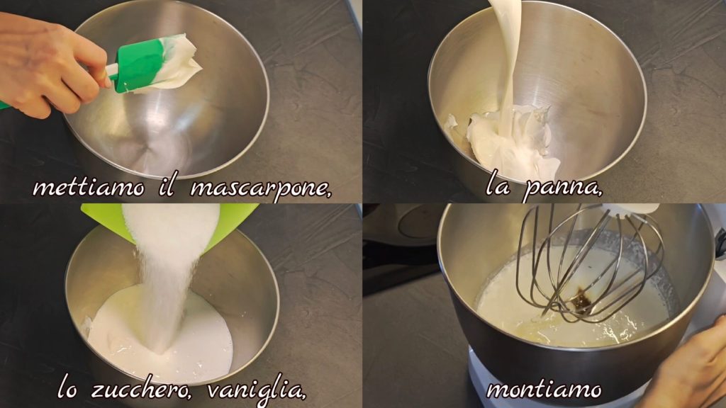 Wir geben den Mascarpone, den Zucker, die Sahne und die Vanille in eine Schüssel und schlagen alles zu einer Creme.