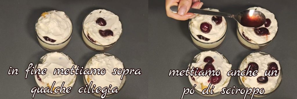Wir schlagen die Mischung. Die Kirschen abtropfen lassen und den gewonnenen Sirup mit ein wenig Wasser verlängern. Die in zwei Hälften geschnittenen Löffelbiskuits eintauchen und jeweils zwei Stücke in jedes Glas geben.