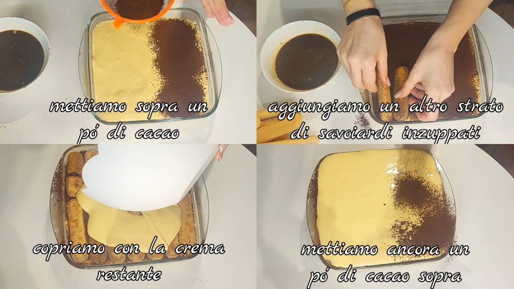 • Wir bestäuben etwas Kakao. Wir legen die zweite Schicht der in gesüßtem Kaffee getauchten Löffelbiskuits (die Hälfte). Wir bedecken mit der restlichen Creme und Kakaopulver.