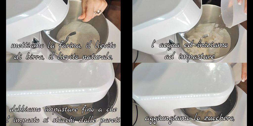 Wir geben das Mehl, die Bierhefe, den Natursauerteig, das Wasser hinzu und beginnen bei niedriger Geschwindigkeit zu kneten. Wir kneten, bis sich der Teig von den Wänden löst, dann geben wir nach und nach den Zucker hinzu.