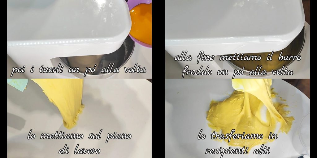 Dann geben wir nach und nach die Eigelbe hinzu und kneten dabei immer bei niedriger Geschwindigkeit. Wir fügen die Orangenschale und die Vanille hinzu. Zum Schluss geben wir die Butter in Stücken hinzu. Die Gesamtzeit beträgt etwa 30 Minuten. Wir übertragen den Teig auf die Arbeitsfläche.