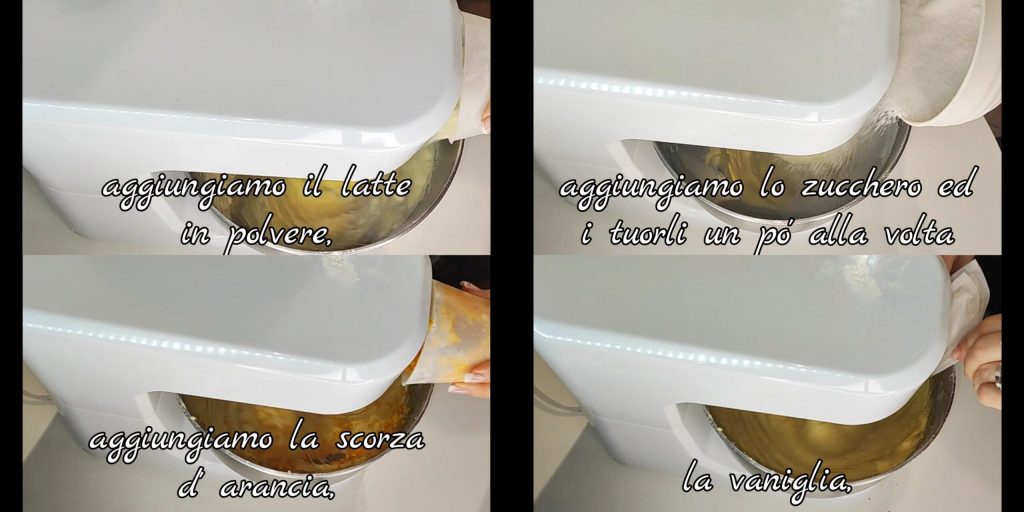 Wir fügen das Milchpulver hinzu und kneten, bis sich der Teig von den Wänden löst. Wir geben den Zucker und die Eigelbe nach und nach hinzu und kneten dabei immer bei niedriger Geschwindigkeit. Wir fügen die Orangenschale und die Vanille hinzu.