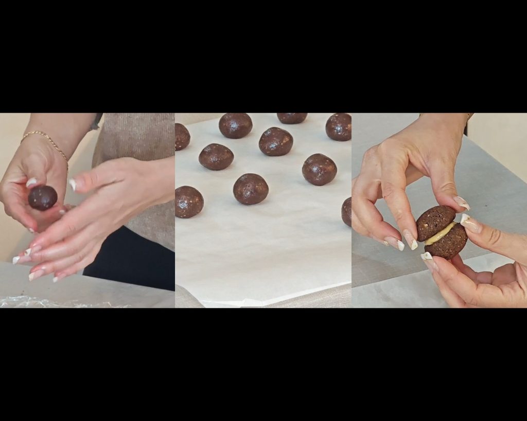 • Nach der Ruhezeit nimm nach und nach etwas Teig und forme Kugeln in der gewünschten Größe. Auf ein mit Backpapier ausgelegtes Backblech legen und gut verteilen. Im vorgeheizten Ofen bei 180°C ca. 20 Minuten backen, bis die Kekse leicht goldbraun sind. Vollständig auskühlen lassen. Etwas Erdnussbutter auf die Hälfte der Kekse streichen und mit den anderen Hälften zu Sandwiches zusammensetzen. Du kannst auch Marmeladen oder andere Streicherzeugnisse nach Belieben für die Füllung verwenden.