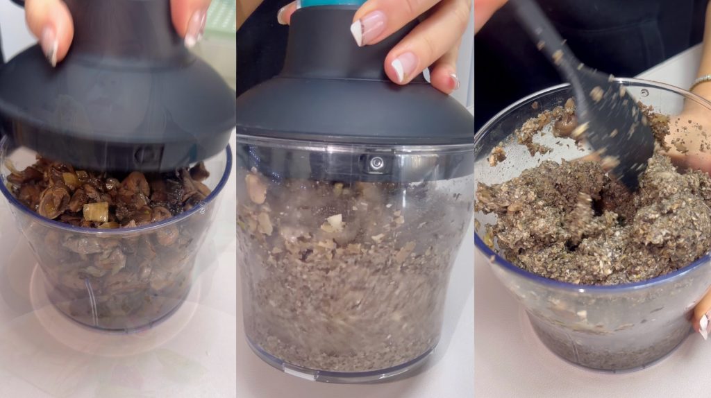 Zuerst hacke ich die bereits gekochten und nach Belieben gewürzten Pilze fein.