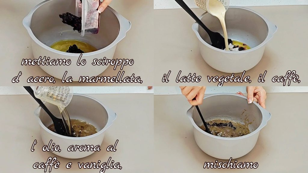 In eine Schüssel Ahornsirup, Marmelade, Pflanzenmilch, Kaffee, Öl, Kaffee-Aroma und Vanille geben und mischen.