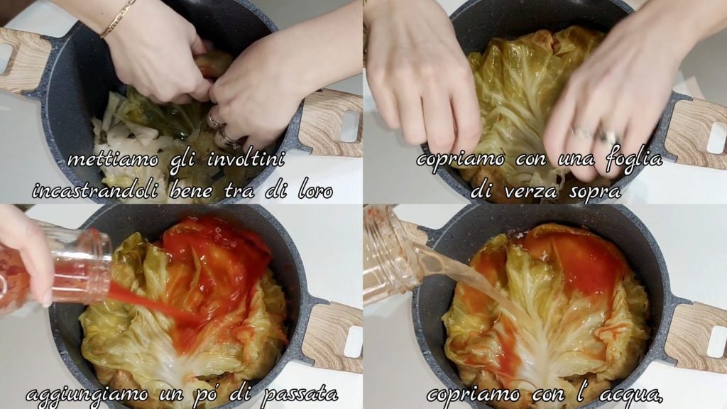 • Dann die Röllchen gut aneinanderreihen. Mit Wirsingblättern bedecken, dann etwas Passata, Wasser hinzufügen.
