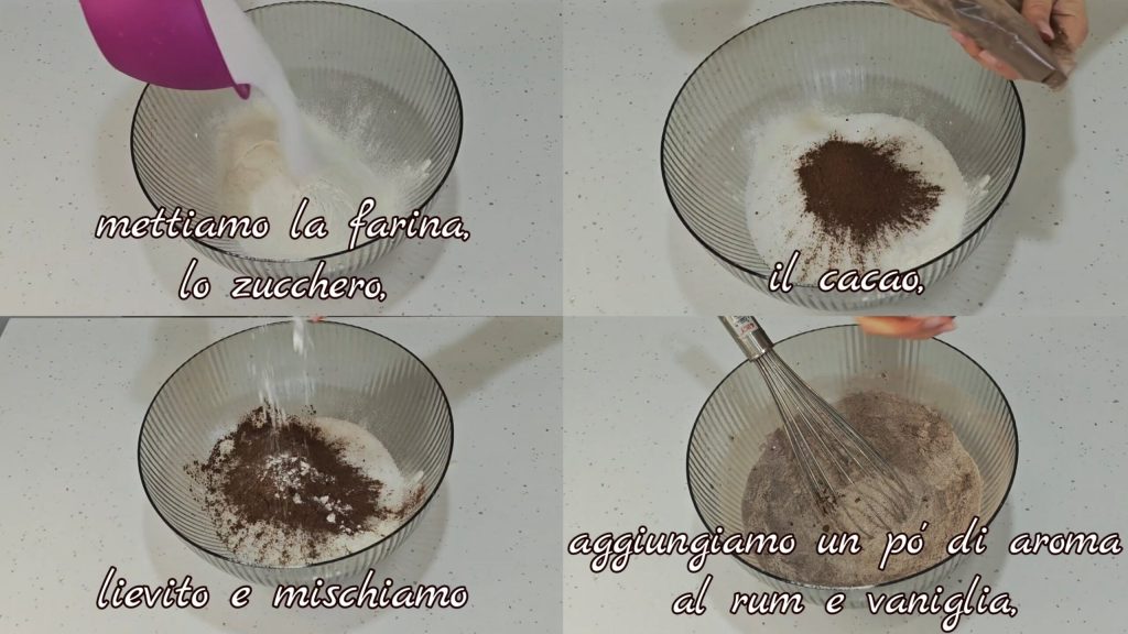 In einer Schüssel geben wir Mehl, Zucker, Kakao, Backpulver und mischen. Ein wenig Rumaroma und Vanille hinzufügen,