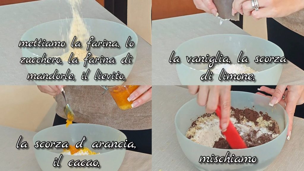 In eine Schüssel geben wir Mehl, Zucker, Mandelmehl, Backpulver, Vanille, Zitronenschale, Orangenschale, Kakao und mischen alles.