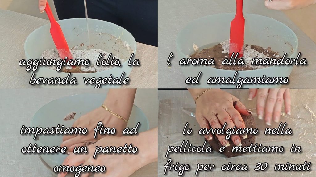 Wir fügen das Öl, das pflanzliche Getränk und das Mandelaroma hinzu und mischen alles. Wir kneten, bis wir einen homogenen Teig erhalten. Wickeln Sie ihn in Frischhaltefolie ein und stellen Sie ihn für etwa 30 Minuten in den Kühlschrank.