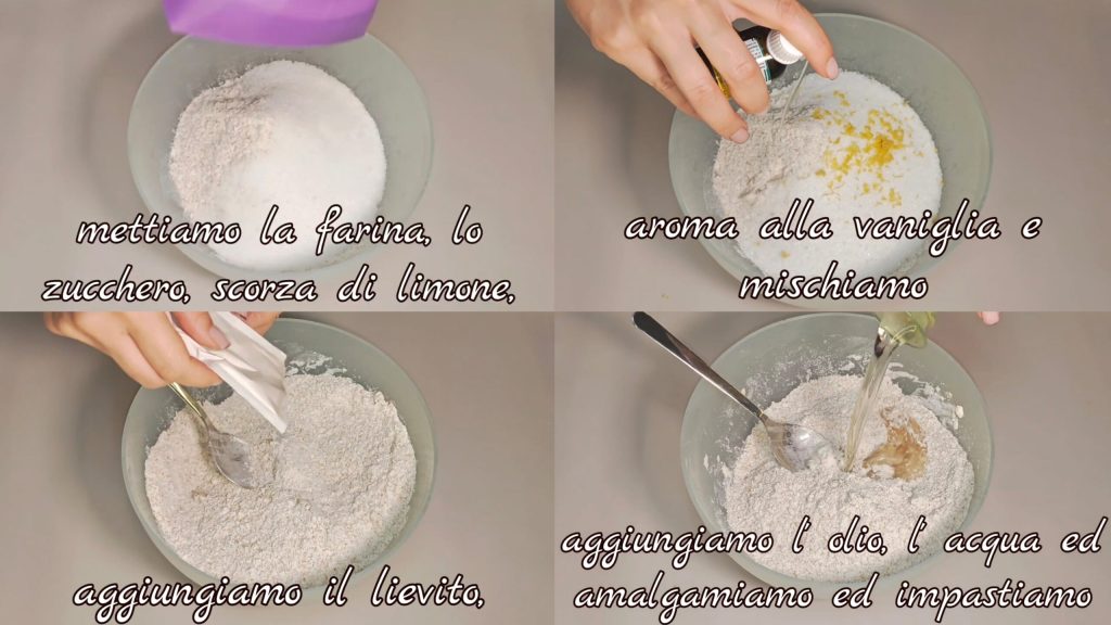 In einer Schüssel Mehl, Zucker, Zitronenschale, Vanillearoma vermischen. Backpulver, Öl, Wasser hinzufügen und mischen und kneten, bis ein homogener Teig entsteht.