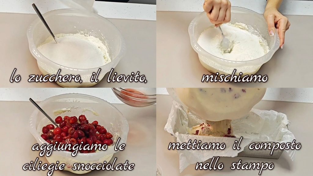 Wir fügen den Zucker, das Backpulver hinzu und mischen. Wir fügen die entkernten Kirschen hinzu und vermischen gut. Die Masse in die Form geben und bei 180° ca. 40 Minuten backen.