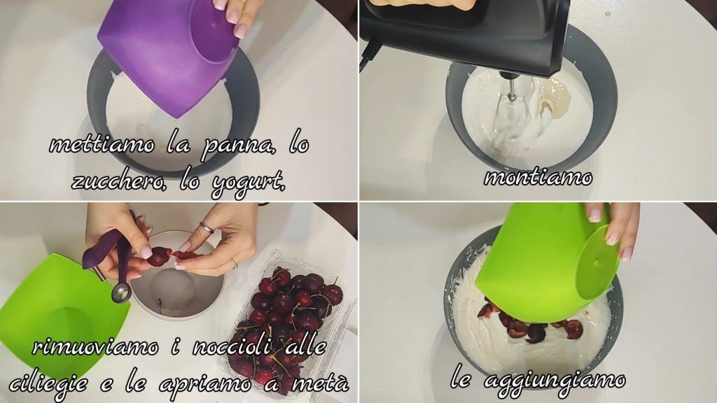 In eine Schüssel geben wir die Sahne, den Zucker, den Joghurt und schlagen sie auf. Wir waschen und putzen die Kirschen, entfernen die Kerne, halbieren sie und fügen sie der entstandenen Creme hinzu.