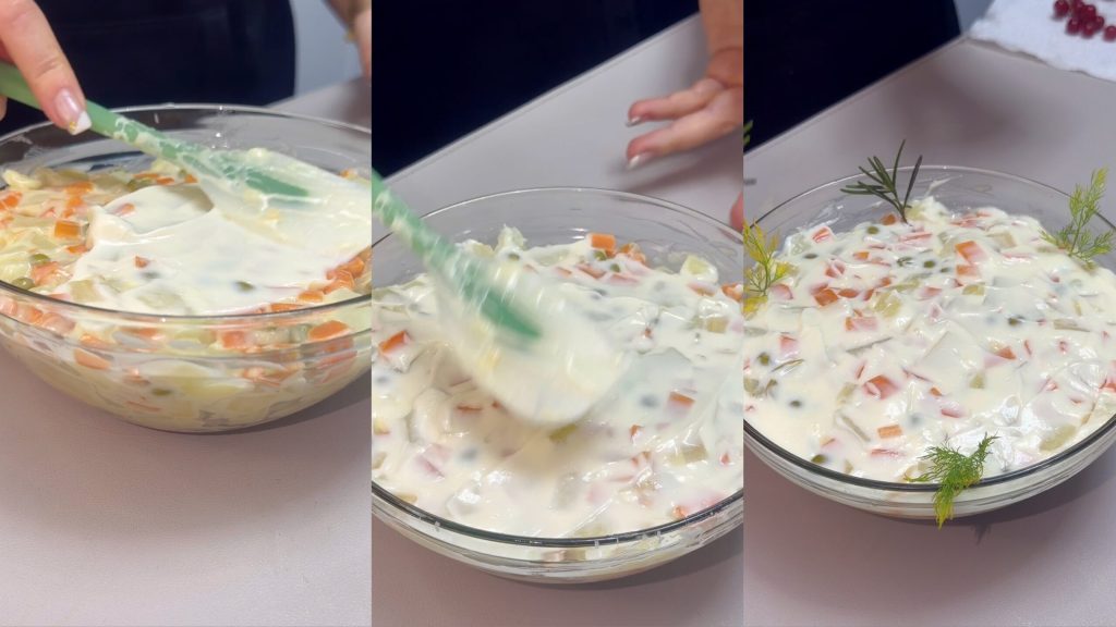 Der Veganer Russischer Weihnachtsalat ist eine festliche, leichte und eindrucksvolle Vorspeise, perfekt für die Festtagstafel. Hergestellt aus Kartoffeln, Karotten, Erbsen und Sellerie und angereichert mit einer hausgemachten veganen Mayonnaise, ist diese Variante komplett ohne tierische Zutaten.