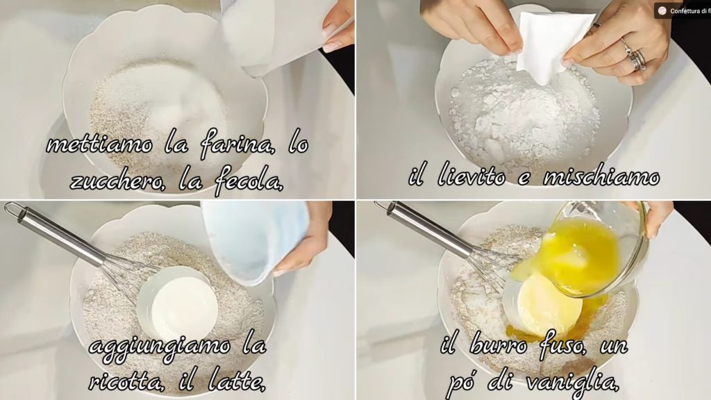 In eine Schüssel geben wir das Mehl, den Zucker, die Stärke, das Backpulver und mischen. Wir fügen den Ricotta, die Milch, die geschmolzene Butter und etwas Vanille hinzu.