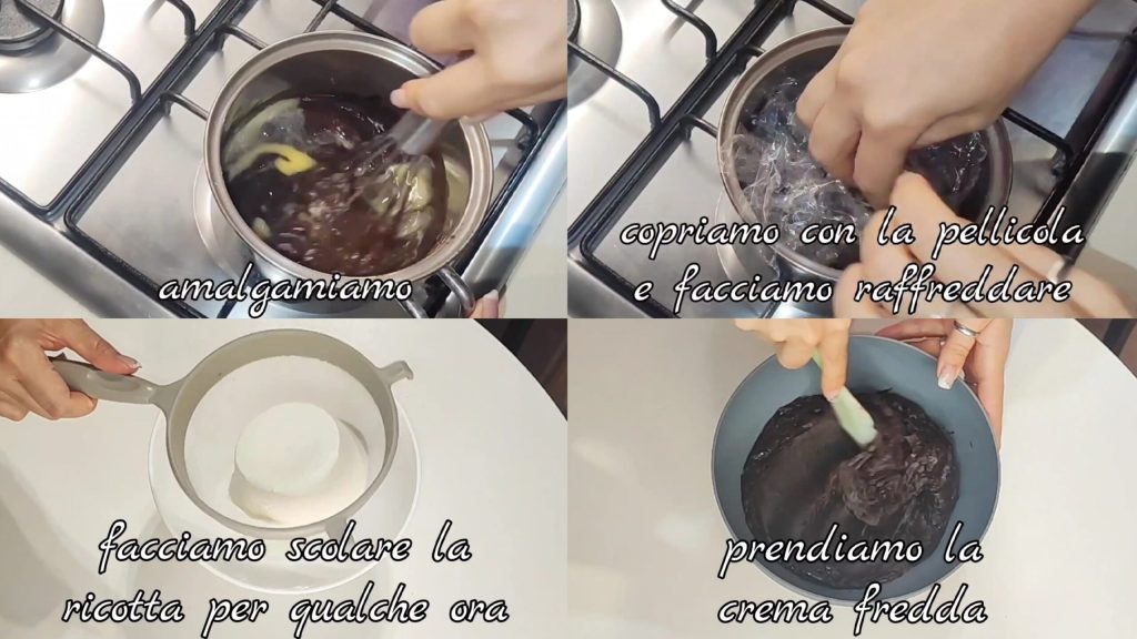 Gut vermischen. Mit Frischhaltefolie abdecken und abkühlen lassen. Den Ricotta einige Stunden abtropfen lassen. Die kalte Creme nehmen.