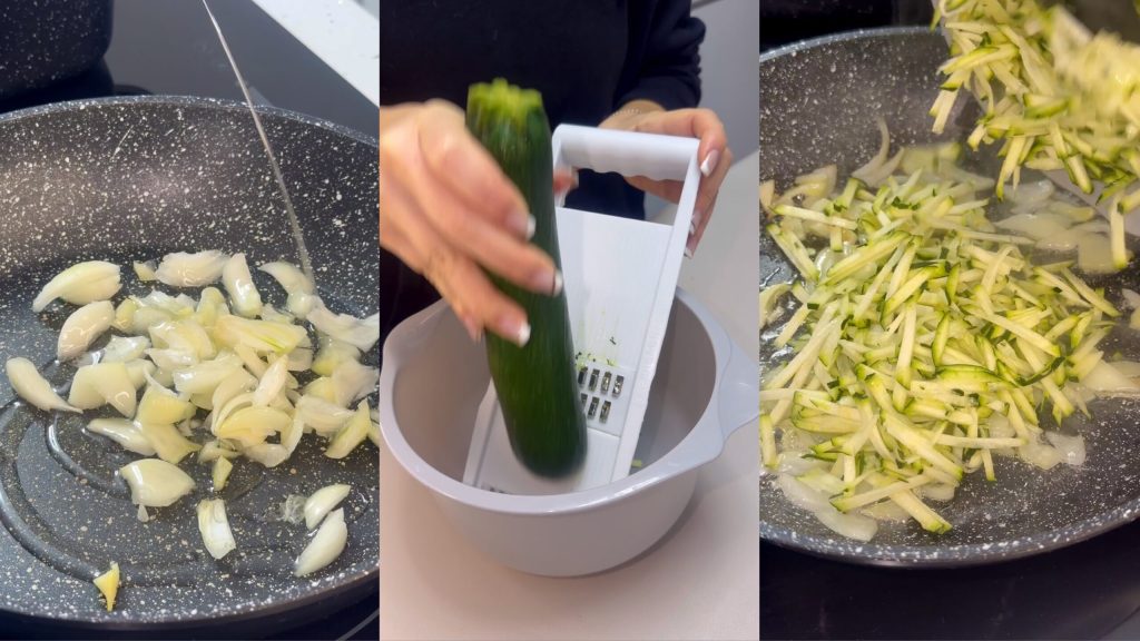 • Die Zwiebel mit etwas Öl anbraten, die Zucchini reiben und hinzufügen, für einige Minuten garen lassen, dann abkühlen lassen.