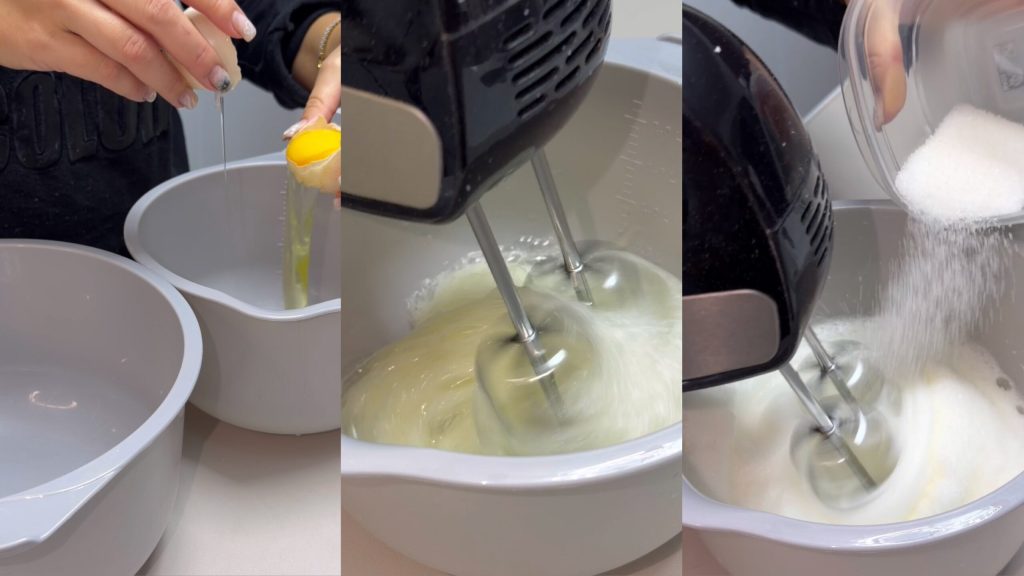 Heizen Sie den Ofen auf 180 °C Ober-/Unterhitze vor. Trennen Sie Eiweiß und Eigelb. Schlagen Sie das Eiweiß mit der Hälfte des Zuckers steif.