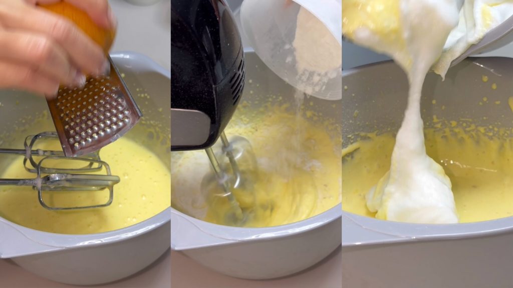 Fügen Sie geriebene Orangenschale und das gesiebte Mehl hinzu und heben Sie vorsichtig das geschlagene Eiweiß unter, indem Sie von unten nach oben mischen.