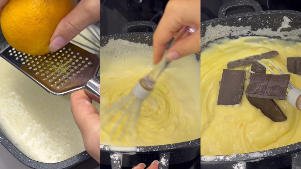 Fügen Sie Orangenschale hinzu und erhitzen Sie die Mischung, bis sie eindickt. Fügen Sie die Zartbitterschokolade hinzu