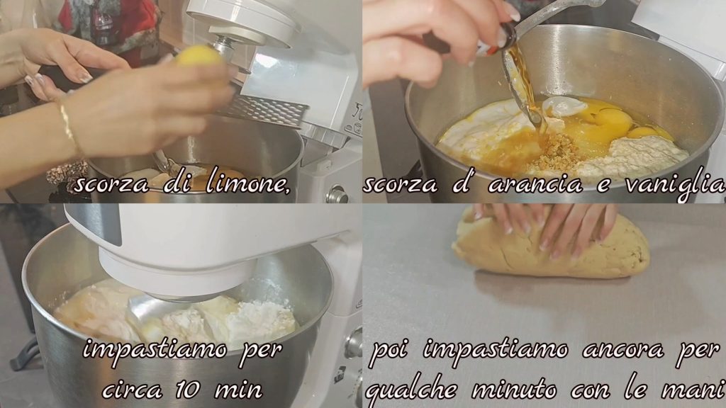Zitronenschale, Orangenschale und Vanille hinzufügen. Etwa 10 Minuten bei niedriger Geschwindigkeit kneten. Dann einige Minuten von Hand kneten.