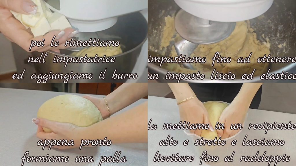 Den Teig wieder in die Küchenmaschine geben und nach und nach die Butter hinzufügen. Kneten, bis ein glatter und elastischer Teig entsteht. Sobald er fertig ist, eine Kugel formen und in ein hohes und schmales Gefäß legen. Bis zur Verdopplung des Volumens gehen lassen.