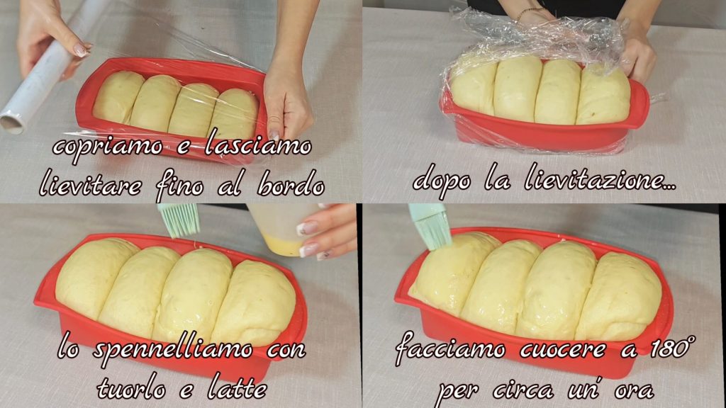 Nach etwa einer Stunde den Teig nehmen und in zwei gleiche Teile teilen. Den ersten Teil nehmen und in 4 gleiche Teile teilen. Ein Teil nach dem anderen ausrollen, kandierte Früchte nach Belieben hinzufügen und aufrollen. Ebenso mit den anderen Teilen verfahren. Die 4 entstandenen Rollen in die Form legen.