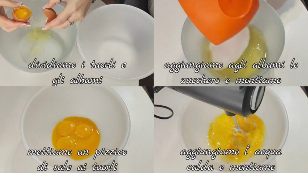 Zuerst trennen wir das Eigelb vom Eiweiß. Zum Eiweiß fügen wir den Zucker hinzu und schlagen es steif. Wir geben eine Prise Salz auf die Eigelbe, fügen das heiße Wasser hinzu und schlagen sie auf.